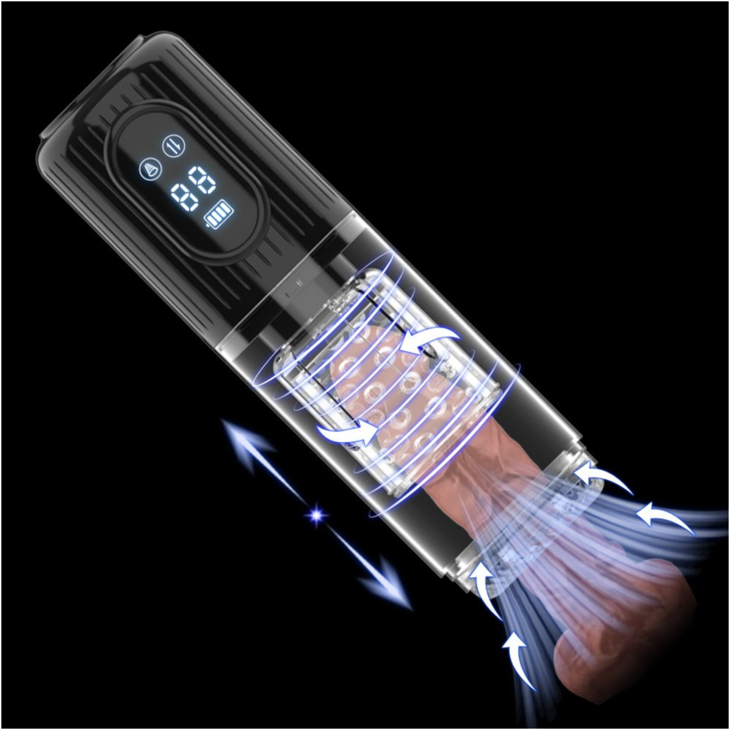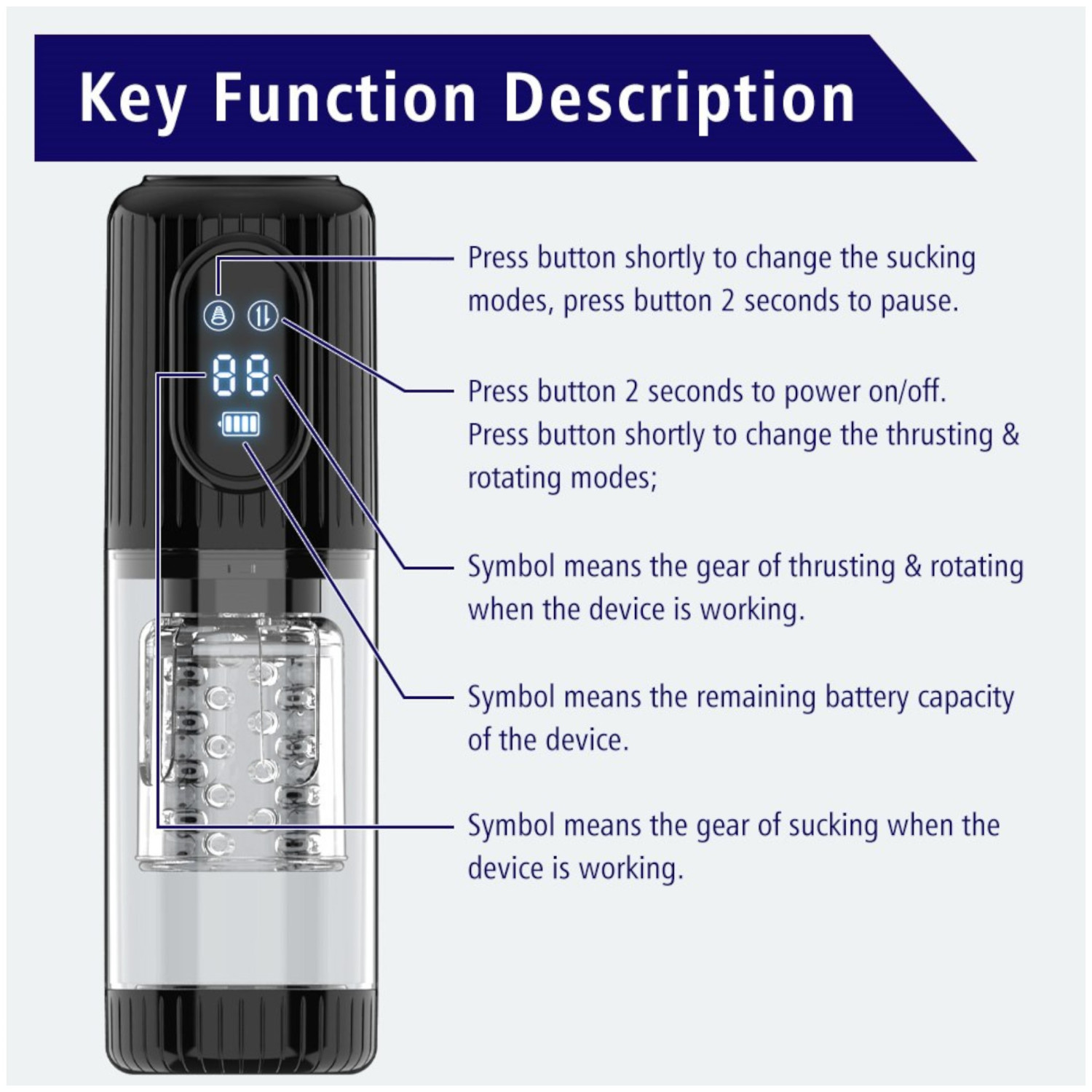 Med ergonomisk plasserte knapper kan du enkelt justere intensiteten på rotasjon, dytting og sug, mens LED-skjermen gjør det enkelt å følge med på innstillingene.