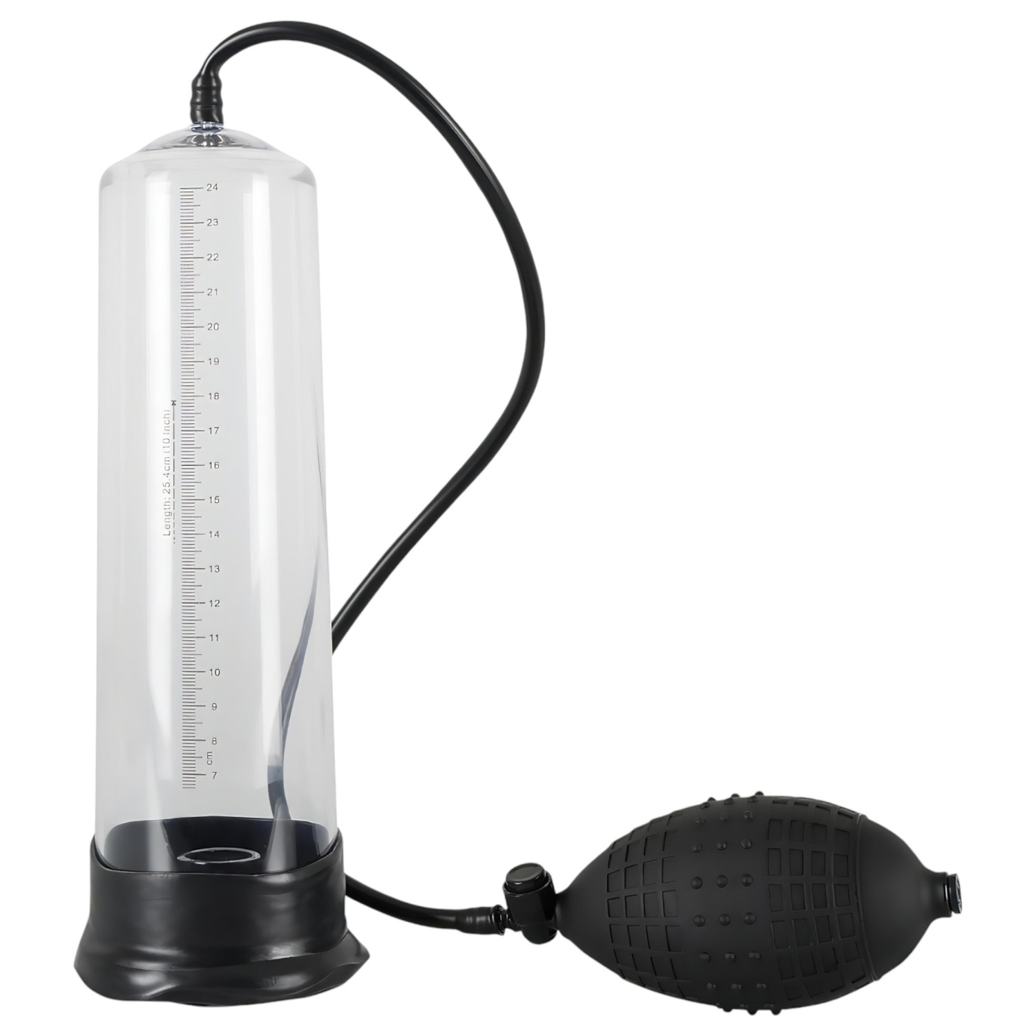 Plasser penis i sylinderen med den fleksible silikonmansjetten, og begynn å pumpe med ballarmen. Vakuumet som skapes fører til økt blodtilførsel, slik at ereksjonen kan utvikle seg raskere. Følg endringen med skalaen på siden av sylinderen. Bruk utløpsventilen på pumpen for å slippe ut luft.