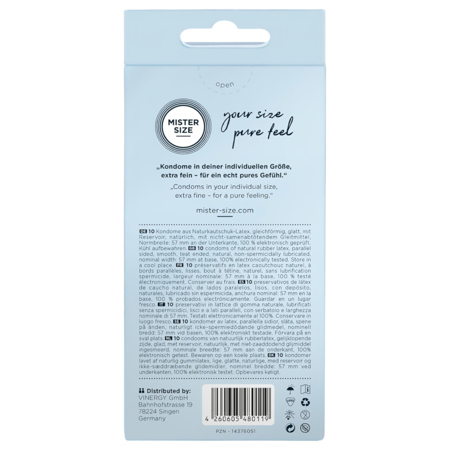 • 10 stk Mister Size 57 mm, ultra-tynn, smurt kondom, individuelt pakket.