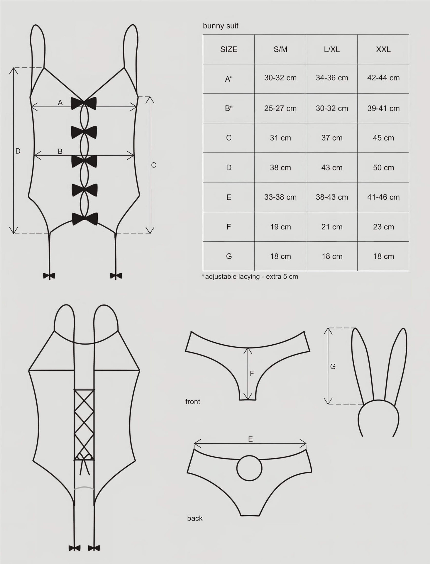 • materiale: truse: 88% polyester, 12% elastan; strømper: 80% nylon, 20% elastan; ører: 100% polyester