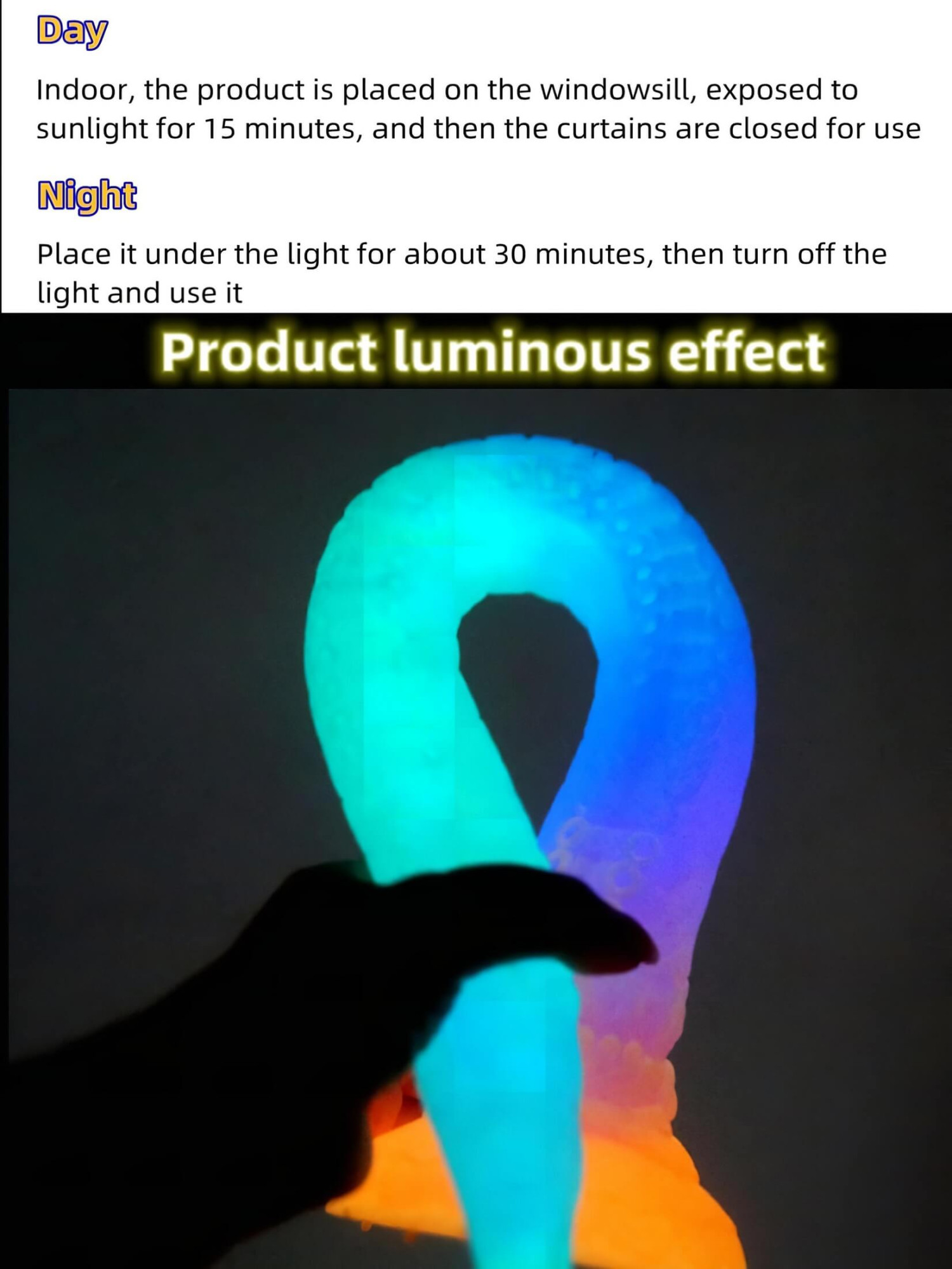 • Glow-in-the-Dark teknologi - den glitrende kroppen kan lades med lys og lyser i mørket