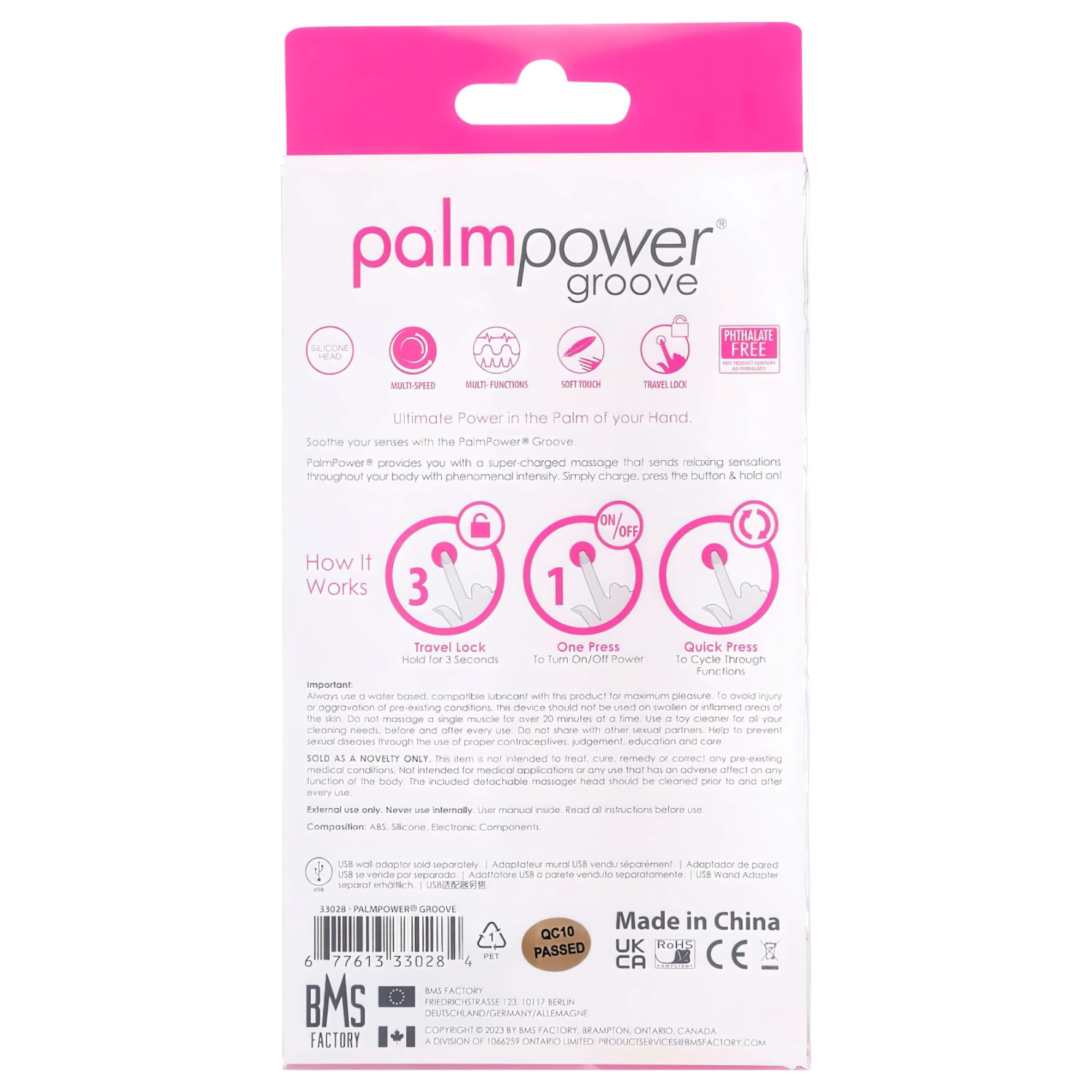 Det er bare én knapp på massasjeren (over palmpower-teksten). Hold den inne for å tilbakestille enheten. Trykk videre for å bytte mellom vibrasjonsmodusene. For å slå av vibrasjonen, hold knappen inne lenge. For å slå av enheten helt, hold inne til to korte vibrasjoner bekrefter fullstendig avstengning.