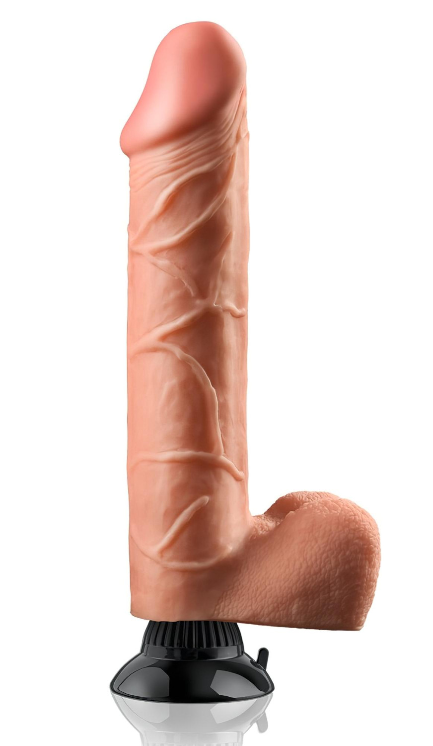 Naturfarget vibrator med testikler, fleksibelt belegg som føles silkeaktig, akkurat som ekte hud.