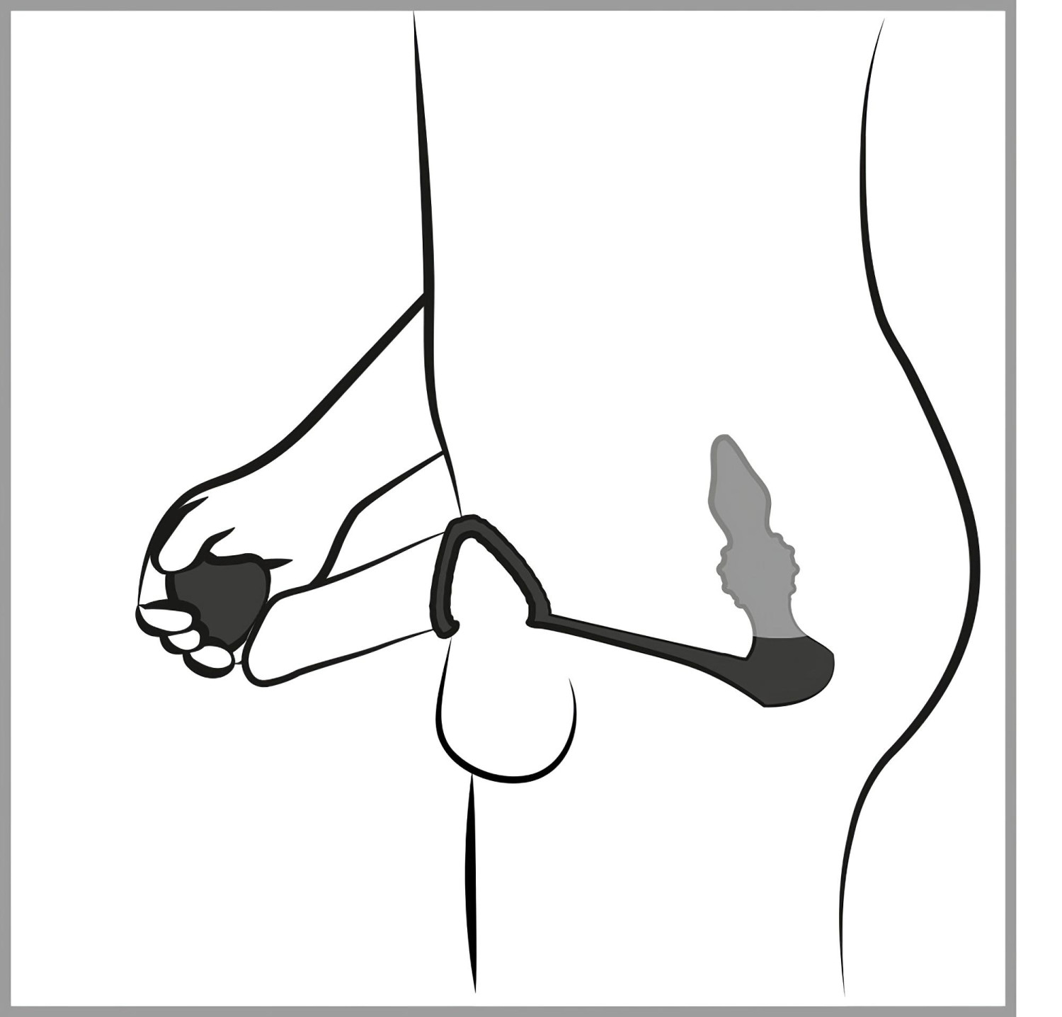 • Påfør litt glidemiddel på penis, og trekk penisringen over en halvstiv eller stiv penis halvveis, smør deretter anus og analvibratoren. Når du er klar, føres vibratoren forsiktig inn i anus (vær oppmerksom på at midtdelen av vibratoren er større og har en annen overflate) og juster ringen til at den sitter ved roten av penis. Plasser testikkelringen bak testiklene for sikker hold.