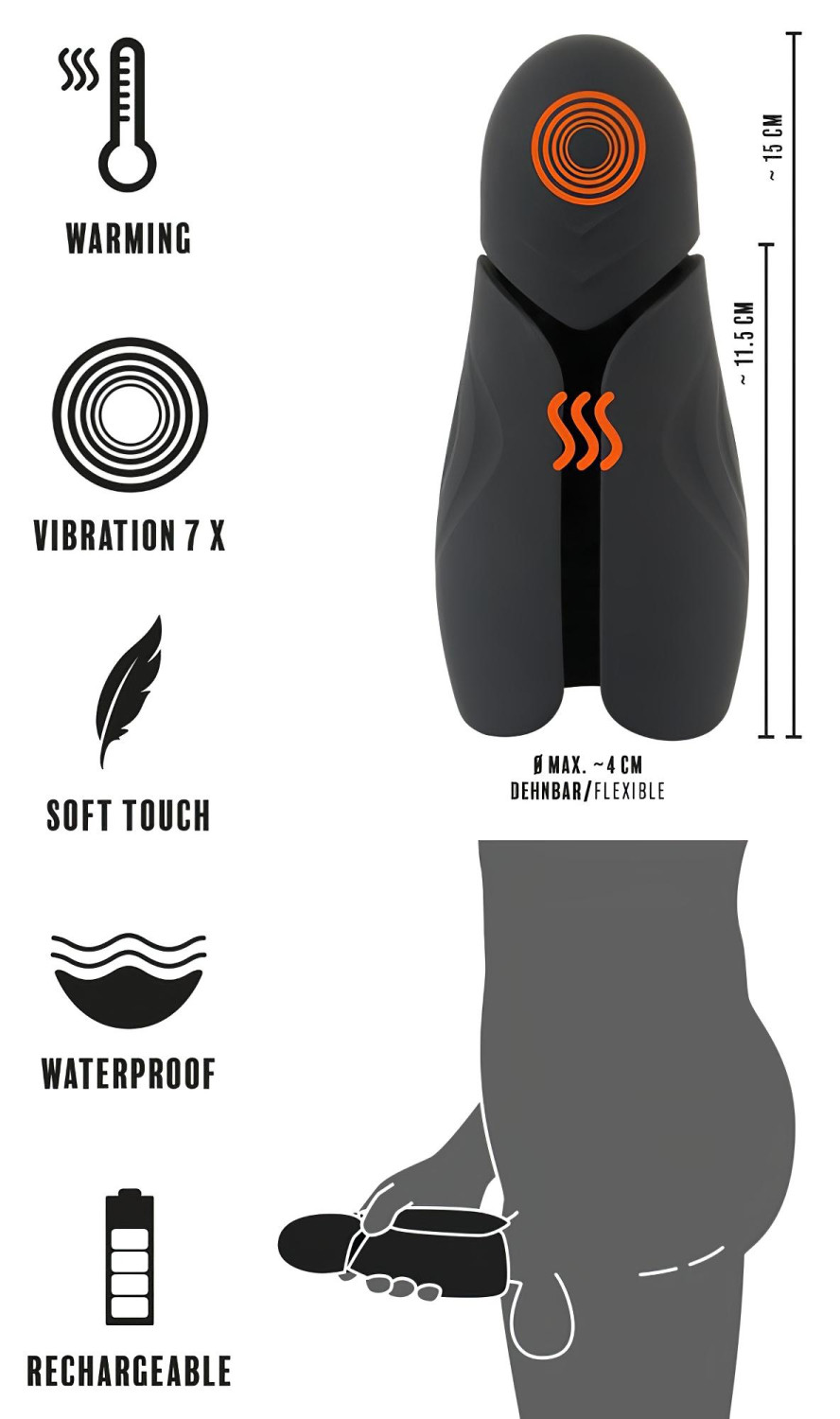 Påfør glidemiddel på penis og den myke indre overflaten av masturbatoren, plasser deretter masturbatoren på penis. Slå på vibrasjonsmodus ved hjelp av knappen, og velg ønsket modus. Nyt den uovertrufne nytelsen som kombinasjonen av varmefunksjon og vibrasjonsmoduser gir.