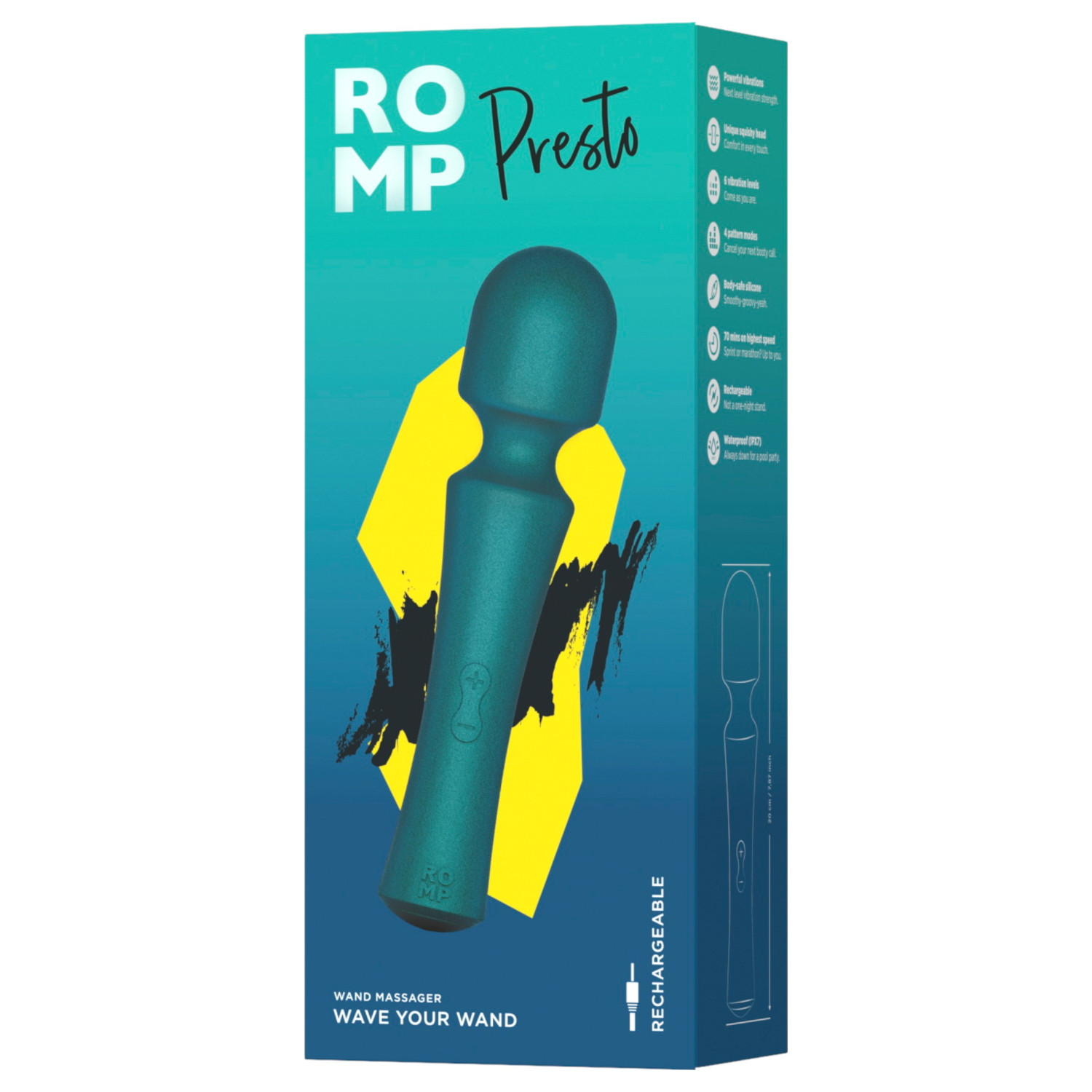 ROMP Presto massasjestav er det perfekte valget for de som søker en stille, men kraftig vibrasjon, lett å håndtere og vanntett enhet. Enten det er for full kropps massasje eller intens intim nytelse, er denne staven alltid klar til å gi nytelse. Det myke, silikone hodet følger fleksibelt kroppens kurver, slik at stimuleringen alltid er komfortabel og målrettet.