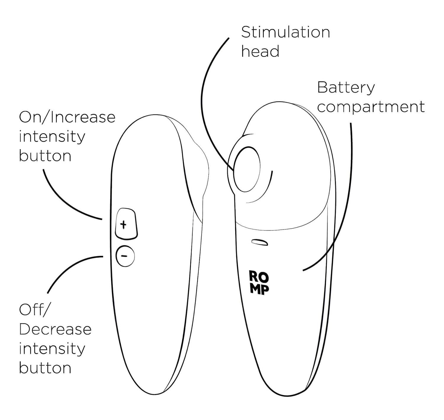 Påfør vannbasert glidemiddel på stimuleringshodet og klitoris og start nytelsen. Trykk og hold inne + knappen i 2 sekunder for å slå på ROMP Switch X. Plasser stimuleringshodet på klitoris med lett trykk. Veksle mellom de 10 intensitetsnivåene ved å trykke på + og - knappene. For å slå av enheten, trykk og hold inne - knappen i 2 sekunder.