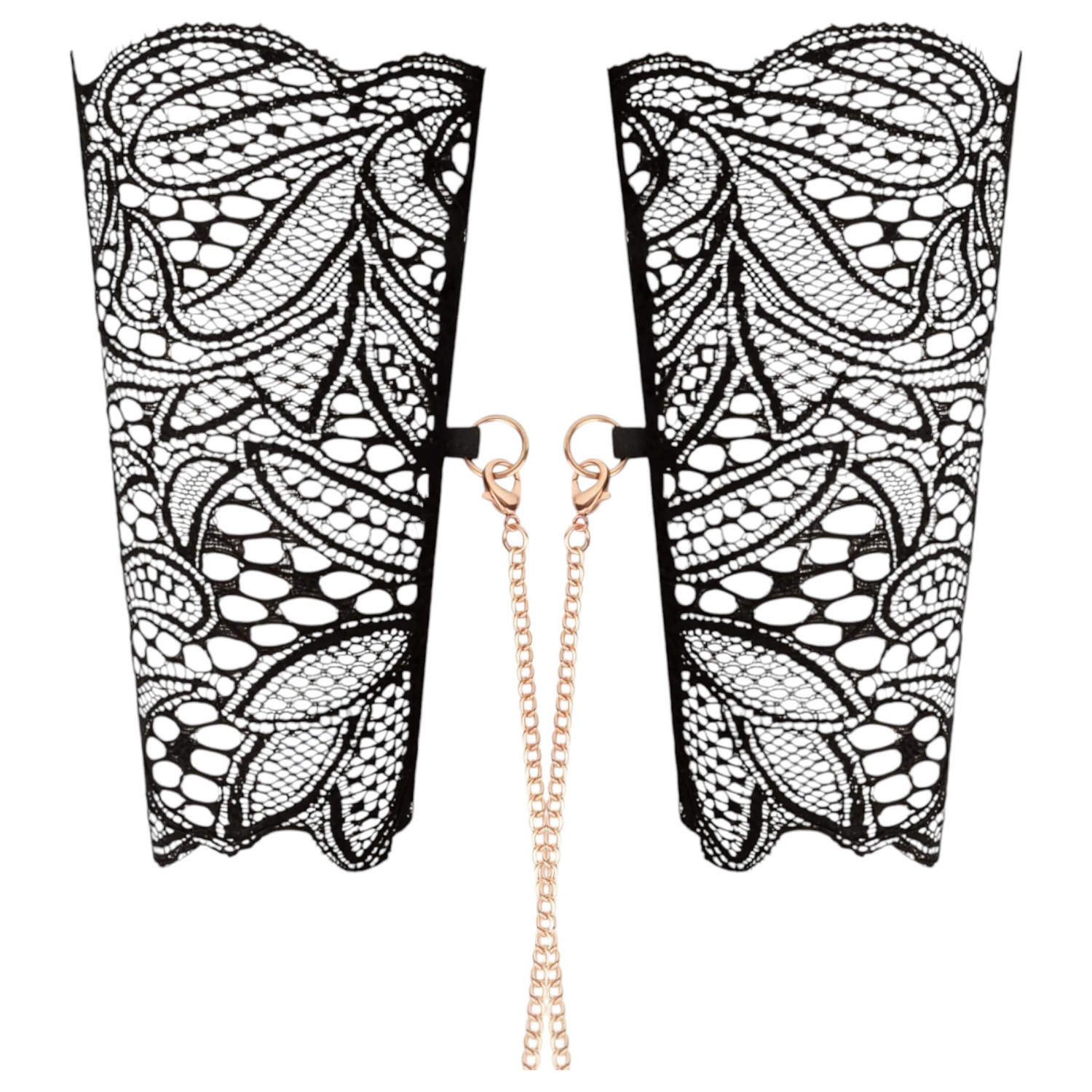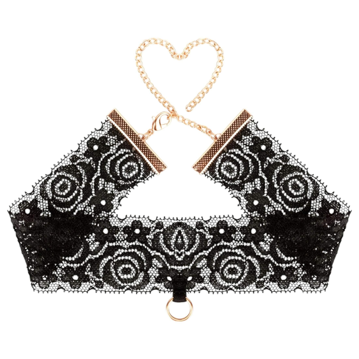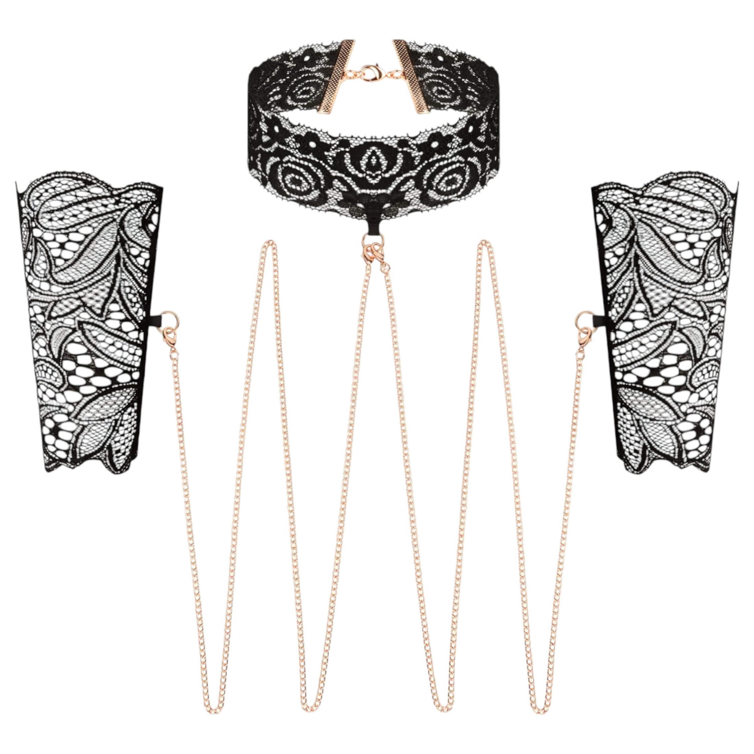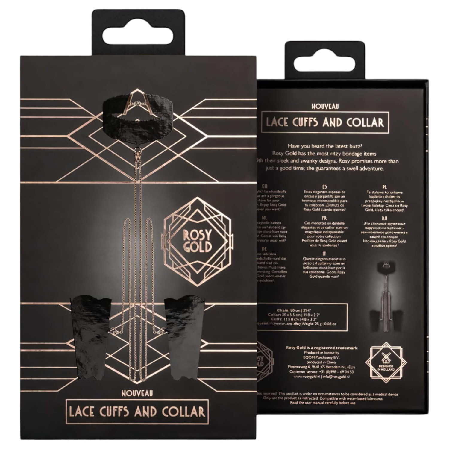 Et Rosy Gold blonder-binder og halsbåndsett er laget av elegant svart blonde, sammenkoblet med gullfargede kjeder.