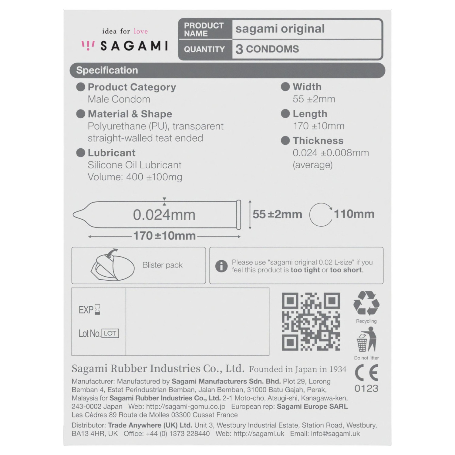 Produktspesifikasjoner – Sagami Original 0.02 kondom (3 stk)