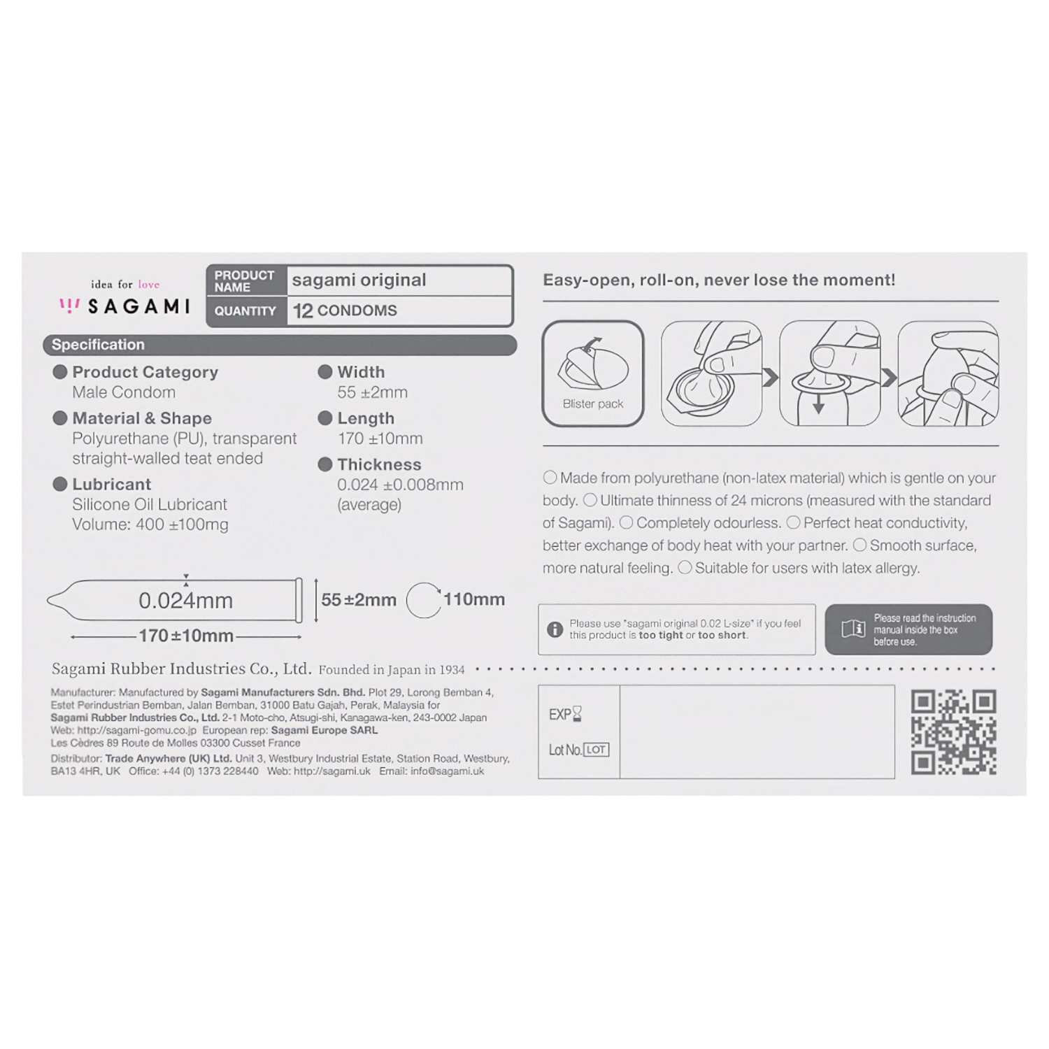 Produktspesifikasjoner – Sagami Original 0.02 kondom (12 stk)
