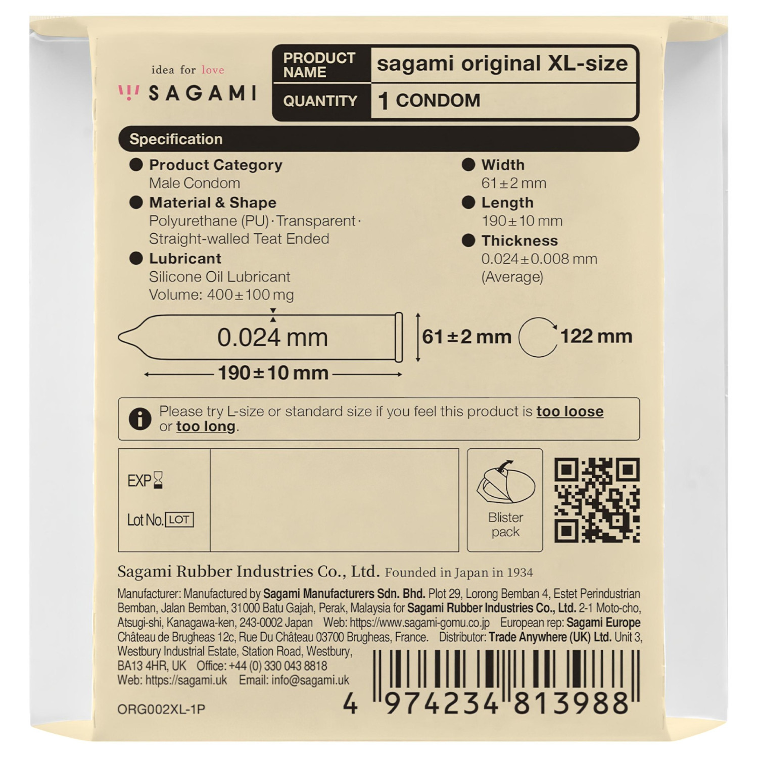 Sagami Original 0.02 XL-Size gir større komfort for de som synes standardstørrelsen er trang. Den er kun ca. 0,02 mm tynn, noe som gjør den nesten umerkelig, samtidig som den er laget av sterk polyuretan. Den er lateksfri, noe som gjør den skånsom mot sensitiv hud, og den leder kroppsvarmen utmerket.