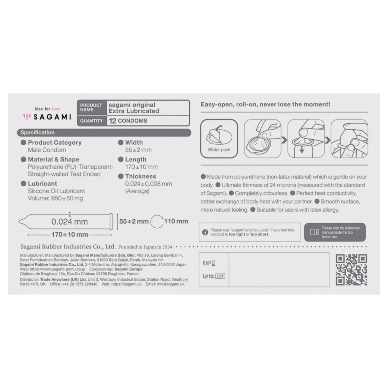 • 12 stk Sagami Original ekstra glidemiddel 55 mm kondomer