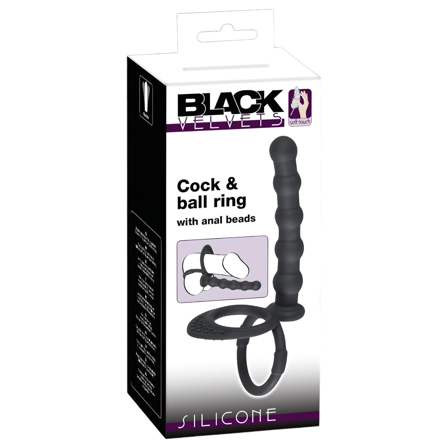 Black Velvet analdildo med penis- og kulebånd som både forsterker ereksjonen og gir en fyldig analopplevelse! Under akten føles skjeden strammere, mens de små kulene på penisringen stimulerer klitoris.