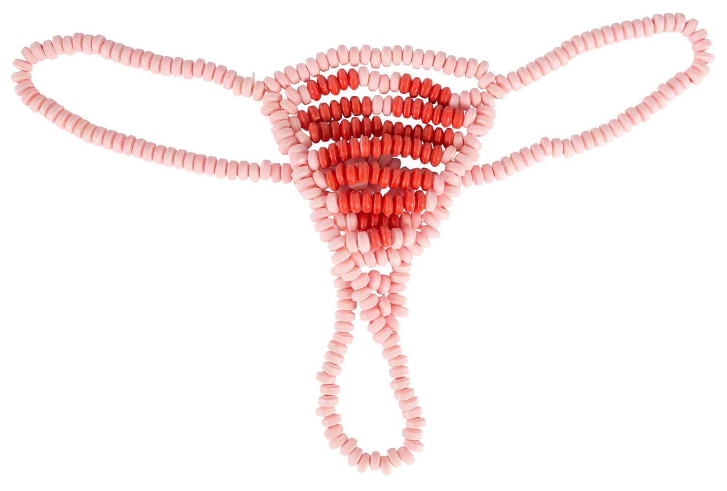 • Spiselig, sexy undertøy av røde-rosa sukkertøyperler