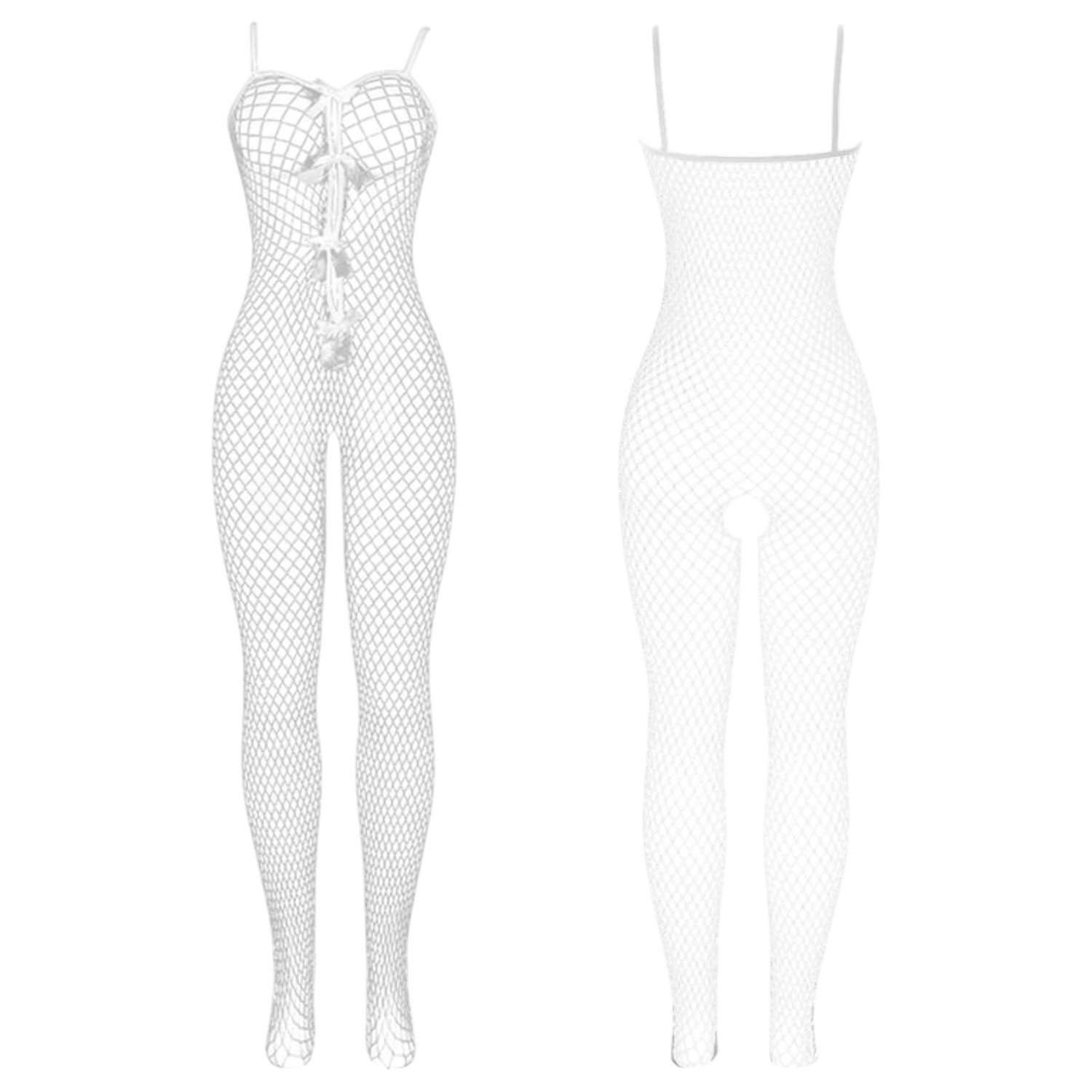 • 1 stykke hvit netting bodystocking med åpen skritt og sløyfedetaljer