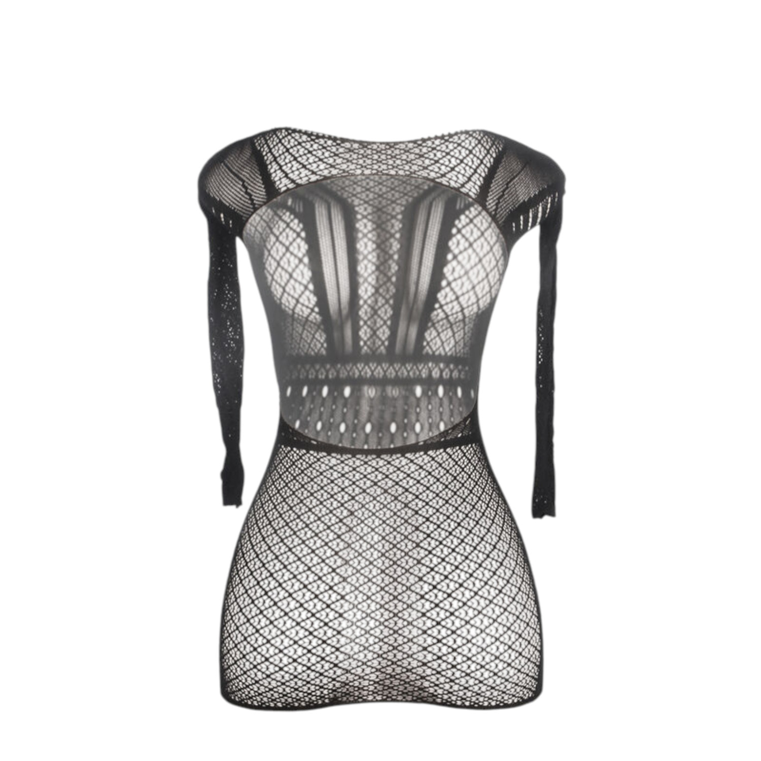 Dette er et svart, åpent undertøy som kan bæres som en minikjole, og kombinerer moderne eleganse med sensuell forførelse for å skape et uforglemmelig utseende på spesielle kvelder!