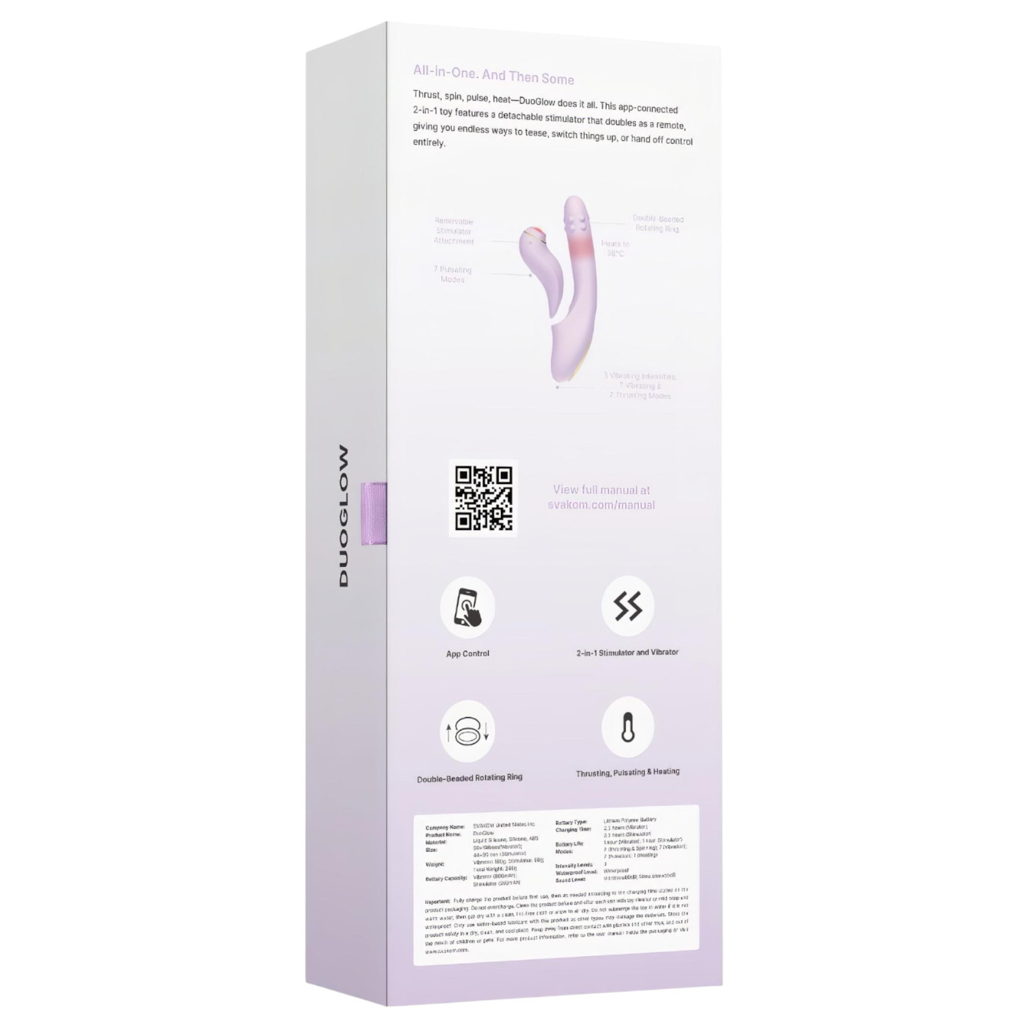 SVAKOM DuoGlow er en 5-i-1 smart G-punkt vibrator og pulserende klitorisstimulator i to deler, som kan brukes sammen i "duett" eller hver for seg – slik at den avtakbare stimulatoren fungerer som en trådløs fjernkontroll.