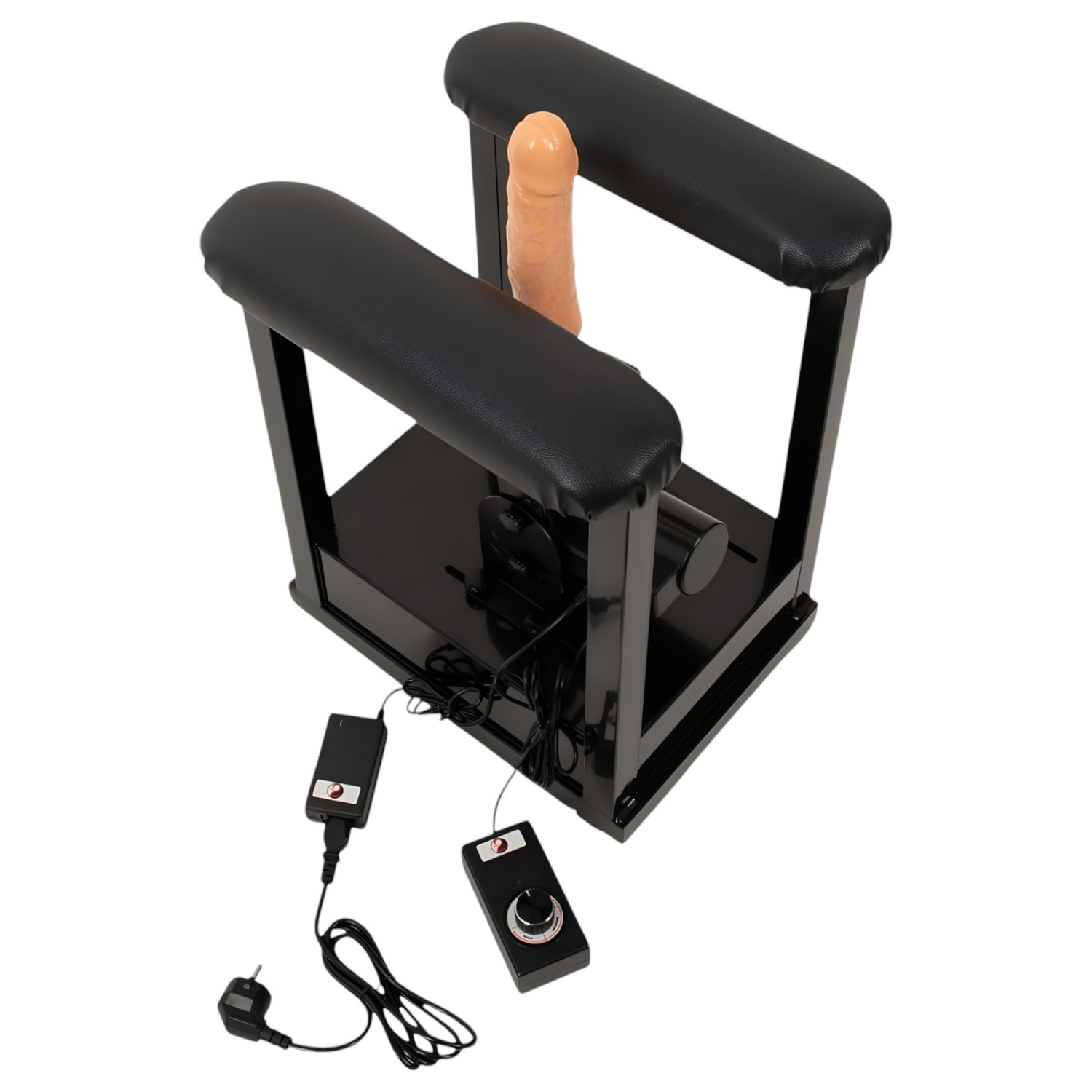 Den medfølgende, realistiske vibratoren kan lett skrus på plass på skyvearmen, og høyden og vinkelen kan justeres perfekt. Den medfølgende unbrakonøkkelen brukes til å stille inn optimale lengder (opp til 8 cm) og frekvenser for støt. Med fjernkontrollen justerer du maskinen med den roterende kontrollen.