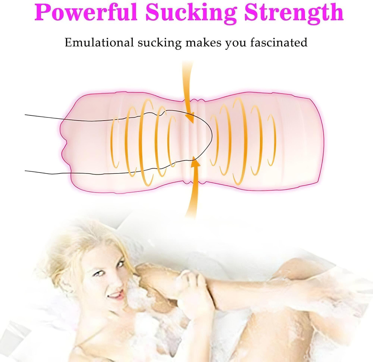 • Det realistiske materialet gjør innføringen enkel. Materialet er mykt og glatt, med livaktig design og dyp hals inne som er behagelig foldet ved inngangen, for så å stramme til med mer trykk på penis.