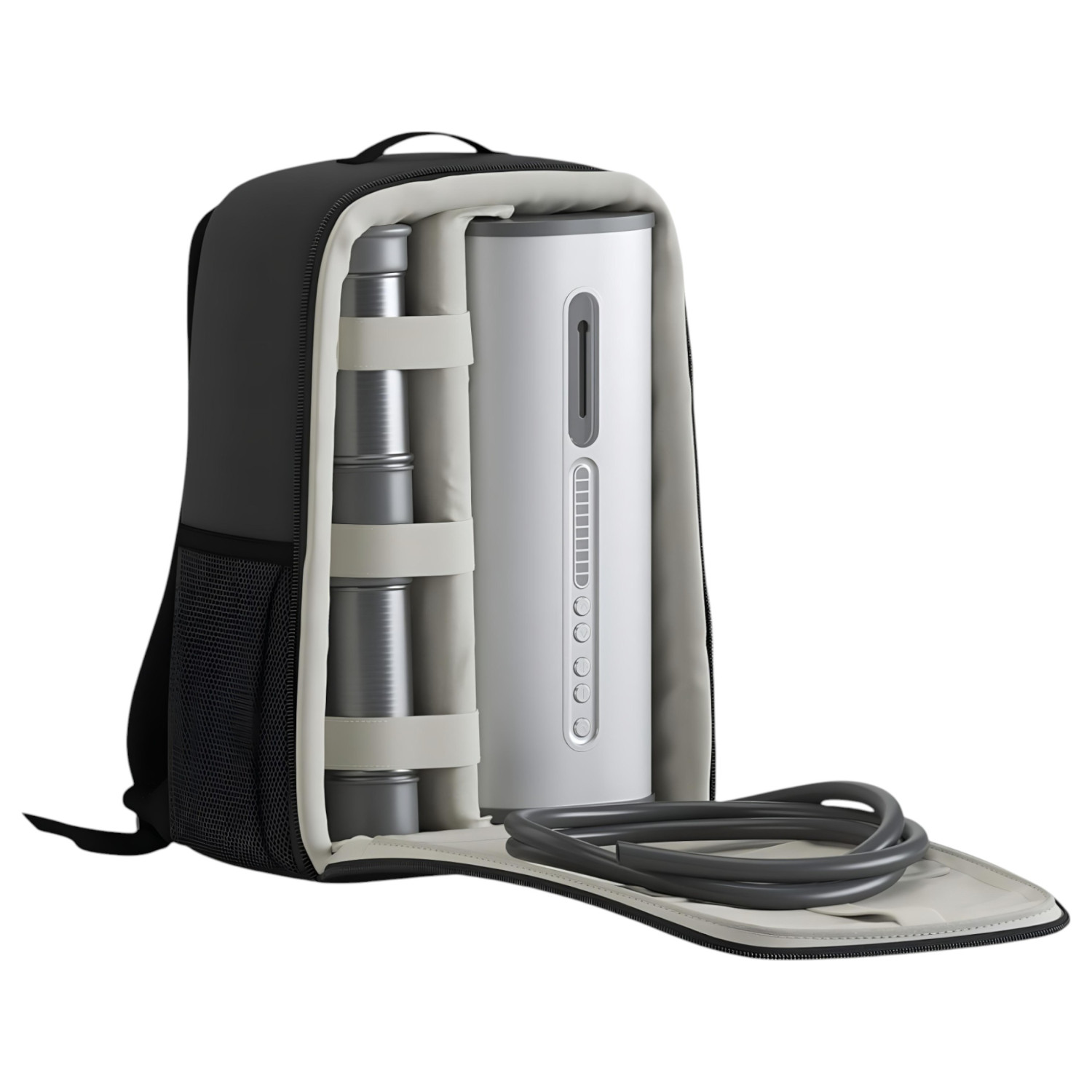 • Maskinen og alt tilbehør er pakket i en ryggsekk av høy kvalitet for diskret lagring