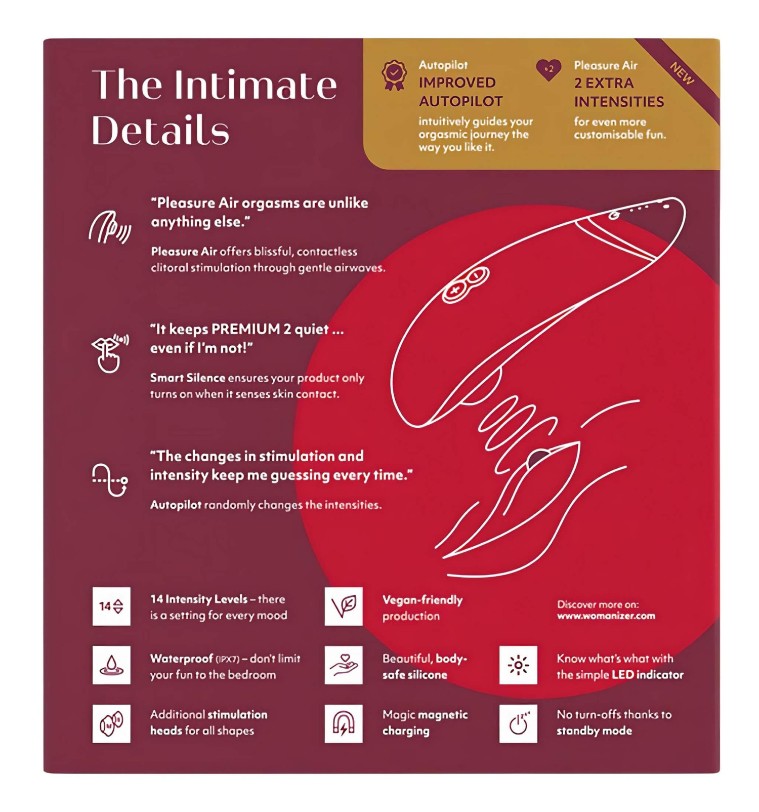Womanizer Premium 2 kombinerer den mest avanserte luftbølgeteknologien med Smart Silence-funksjonen og Autopilot-modusen, noe som gir en unik og uforglemmelig opplevelse hver gang du bruker den.