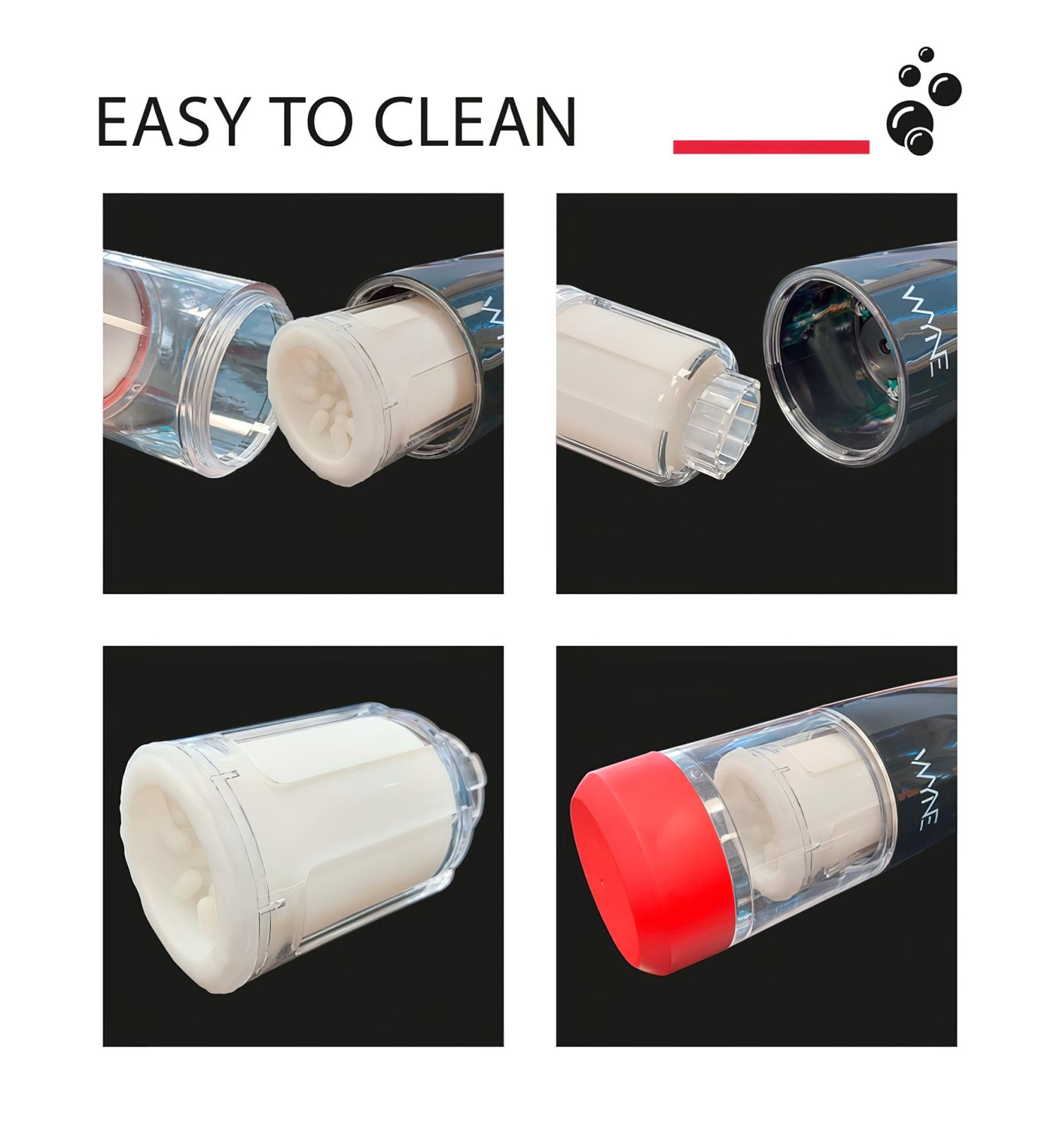 • Nedre del av masturbatoren er gjennomsiktig - så du kan se den roterende delen i aksjon
