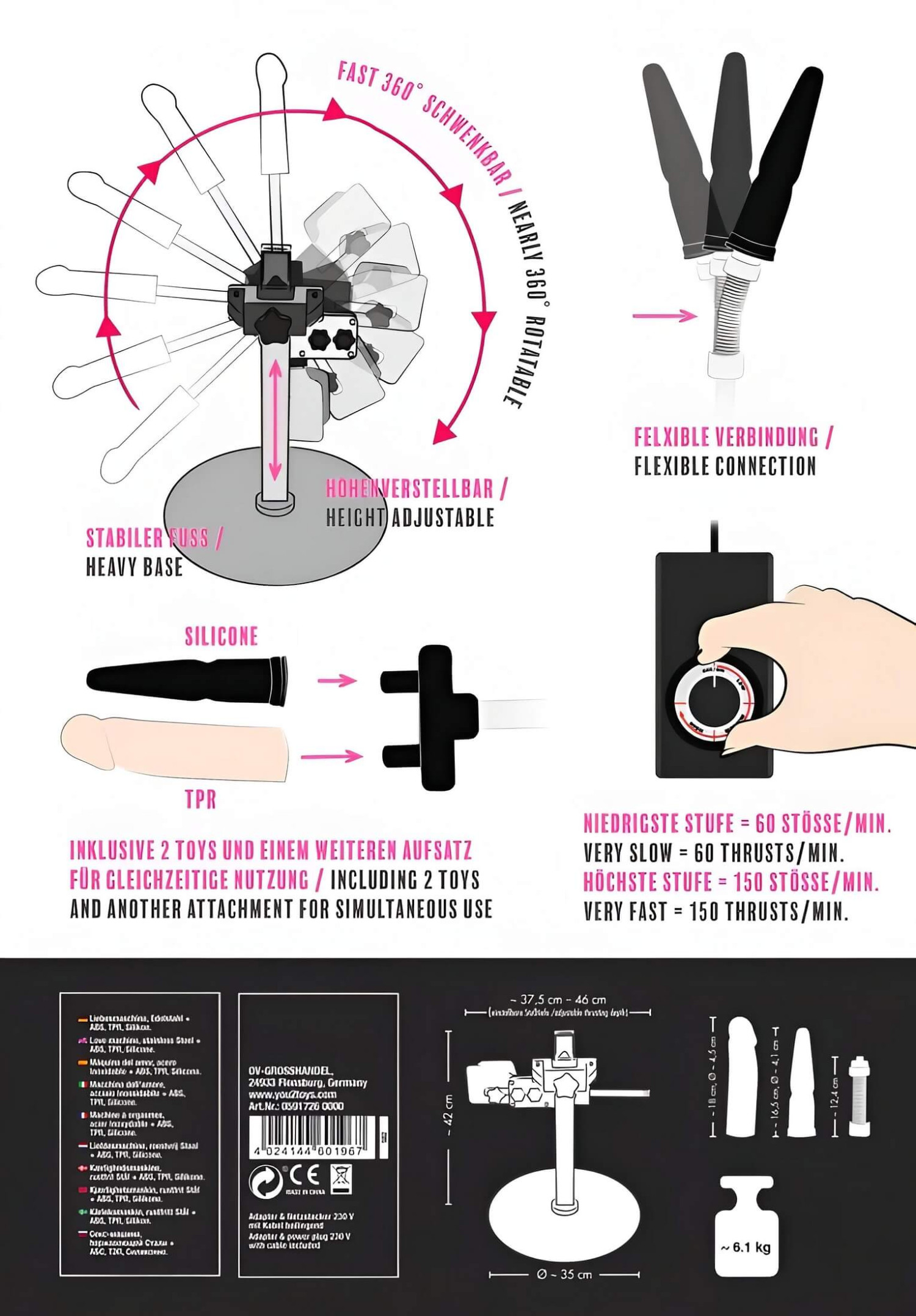 FLERE EKSTRA: Juster maskinarmen og penetreringsvinkelen etter ønske, slik at misjonær, hunde, knebøy eller stående stillinger lett kan prøves ut!