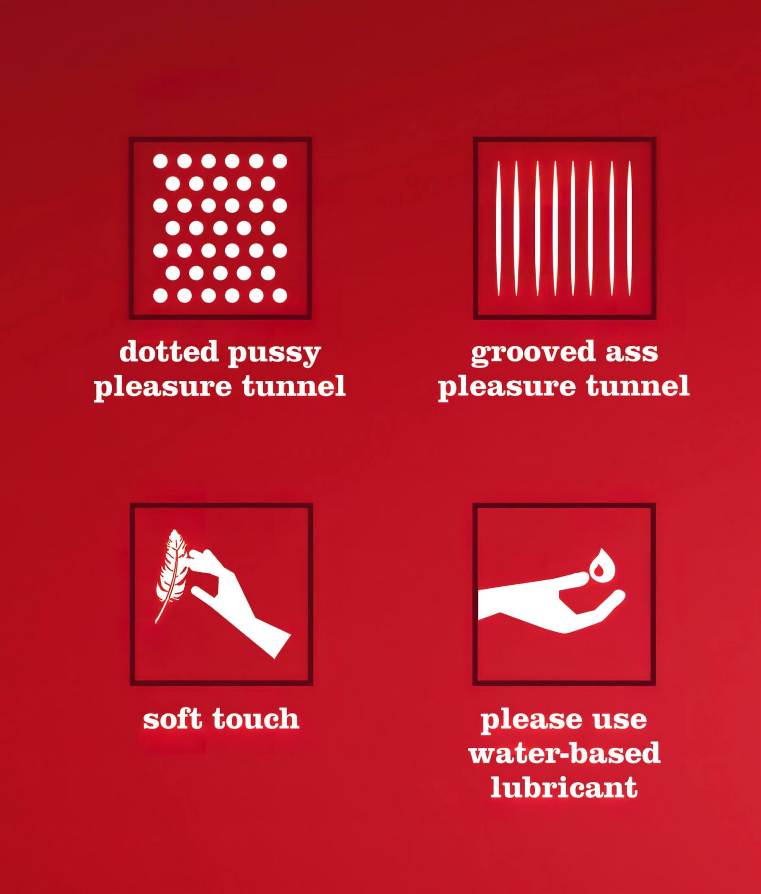 Påfør rikelig med glidemiddel på ønsket kanal før bruk, og nyt den realistiske følelsen! De indre åpningene er åpne, slik at du enkelt kan skylle kanalene etter bruk og la dem tørke.