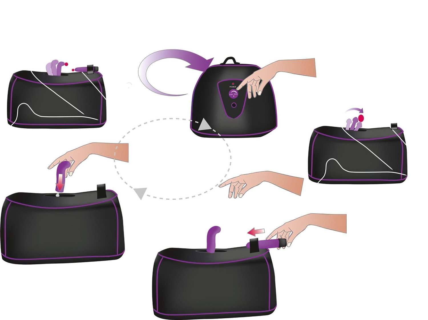 Velg ønsket silikonfeste, plasser det i holderen og koble til strømnettet. Bruk dreieknappen på siden av maskinen for å justere rotasjonshastigheten. Hvis du ønsker ekstra stimulering, plasser den medfølgende stangvibratoren i det tilpassede kammeret og nyt en dobbel opplevelse!