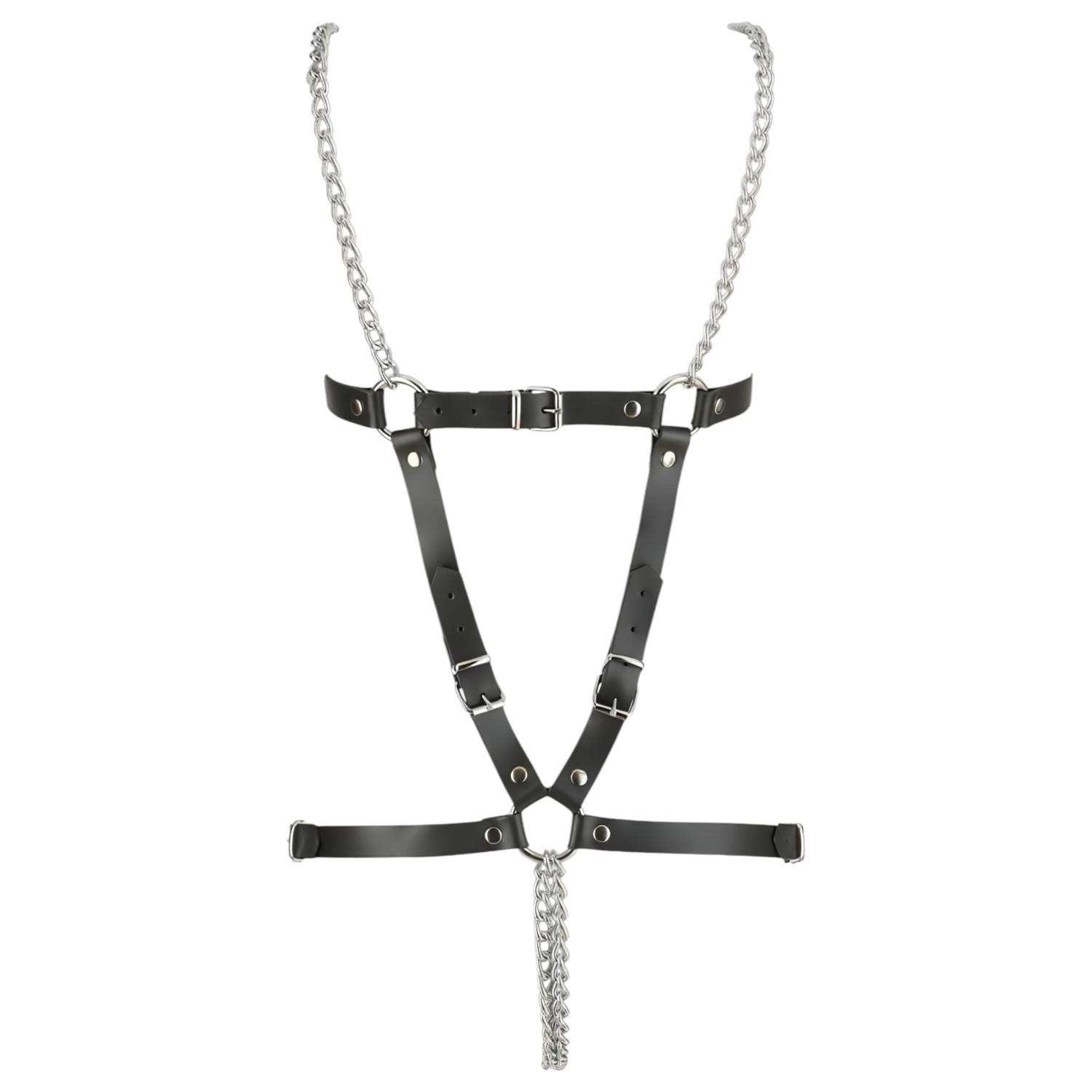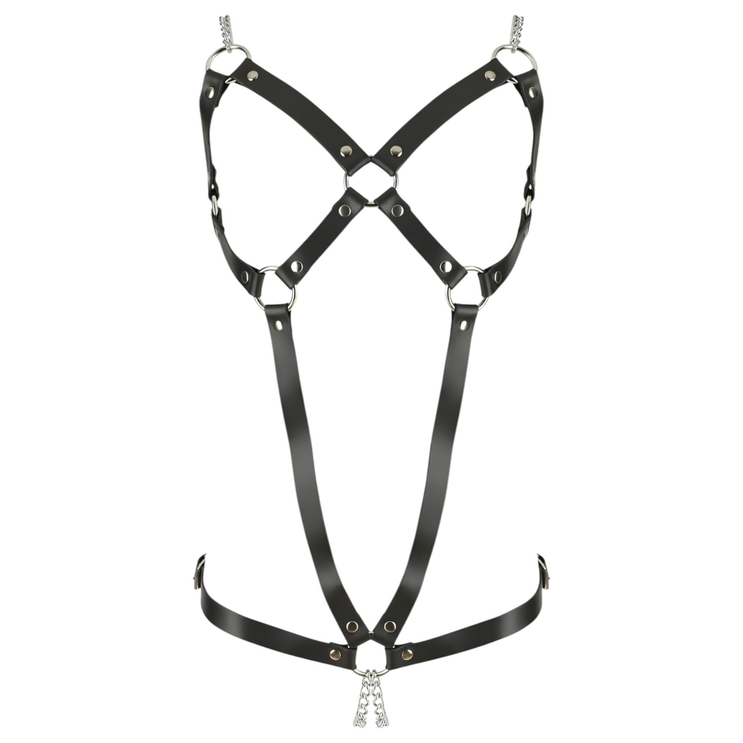 • 1 stykke svart lær body, åpen foran med kjede-stropper.